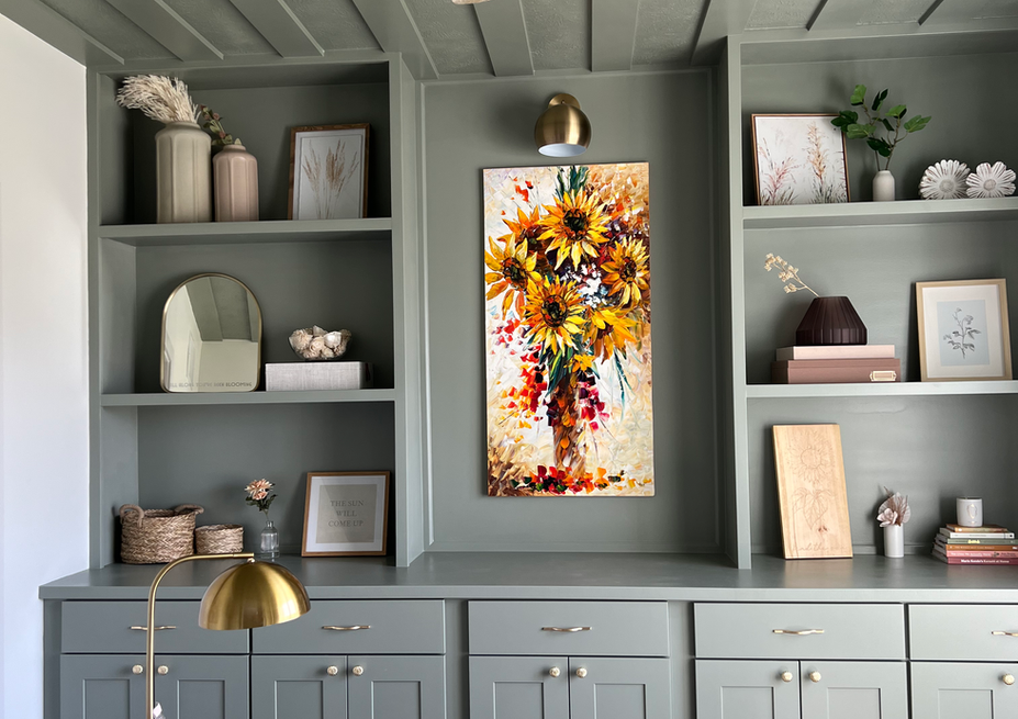 Functional storage, soothing earth tones, and so much natural light transformed this former blank slate builder-grade dining room into a custom home office that makes going to work much more desirable. The floral inspiration was carried through every detail and the color-soaked plank ceiling leaves an unforgettable statement.